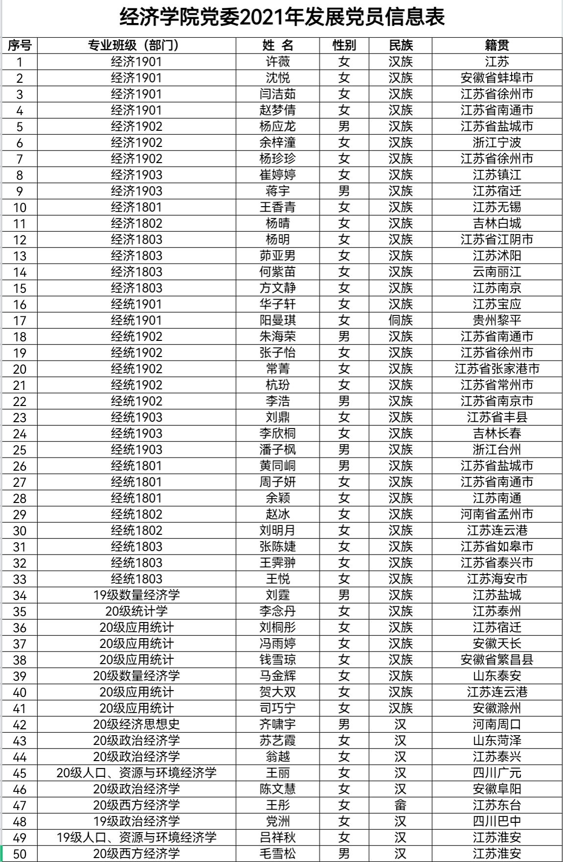 党委预审,拟接收许薇等50名同志为中共预备党员。现将名单予以公示: