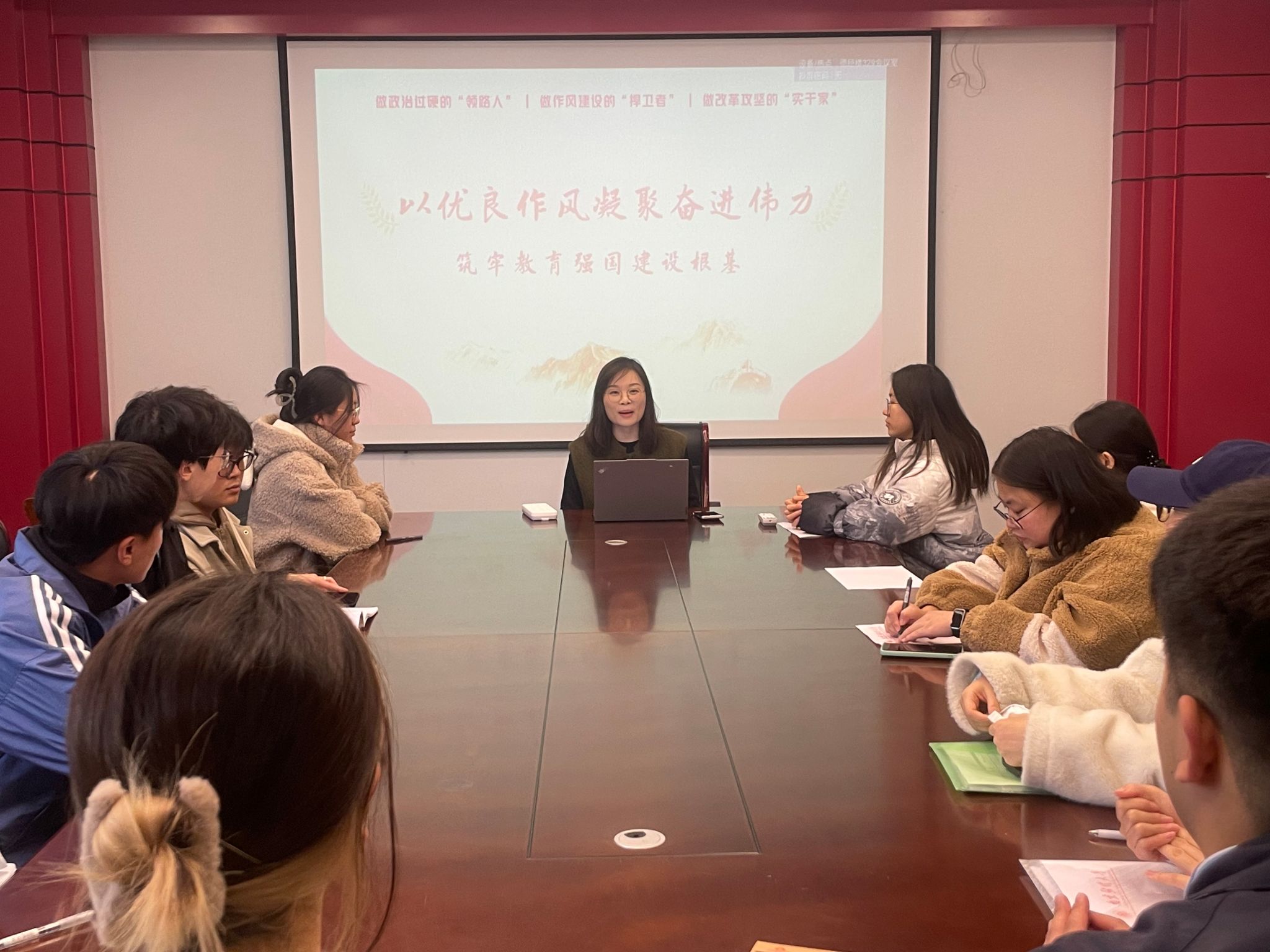 贾亦璞老师以“以优良作风凝聚奋进伟力”为主题展开领学。通过回溯党的作风建设从新民主主义革命时期奠基、社会主义建设时期探索,到新时代深化发展的历史脉络,深入阐释了作风建设的传承与革新;结合革命先辈艰苦奋斗、自我革命的红色故事,揭示了贯穿百年的精神内核;并从强化理论武装、完善制度机制、深化监督问责等维度,提出新时代作风建设的实践路径。希望同学们做政治过硬的“领路人”,做作风建设的“捍卫者”,做改革创新的“先锋队”。
