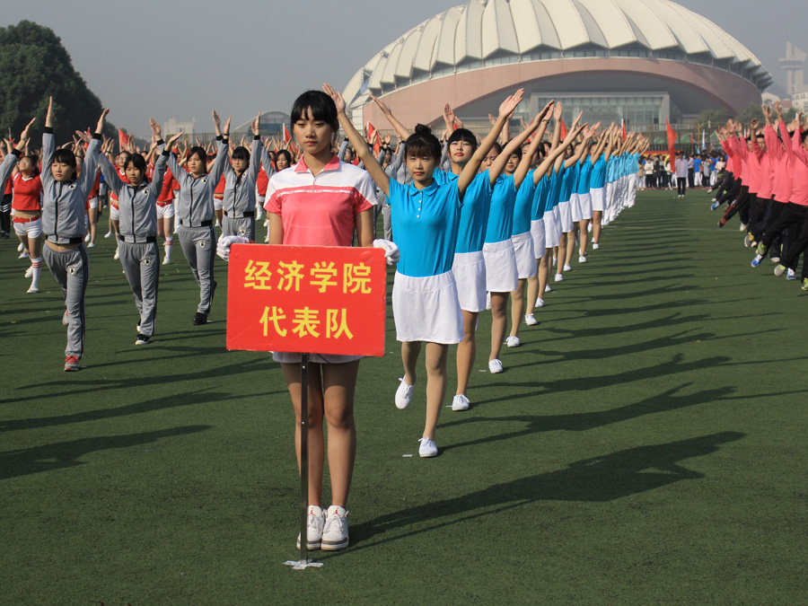 方阵代表队身穿亮眼夺目的蓝白运动服,高举“经院健将,劈波斩浪,气贯长虹,力破苍穹”的口号牌;蓝色的院旗下,广播操代表队以整齐划一的动作,昂扬向上的精神面貌,充分展现了凤凰娱乐城官方