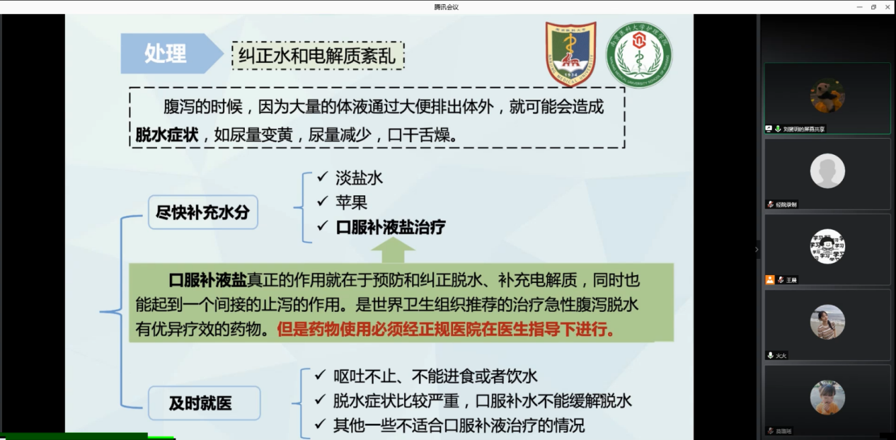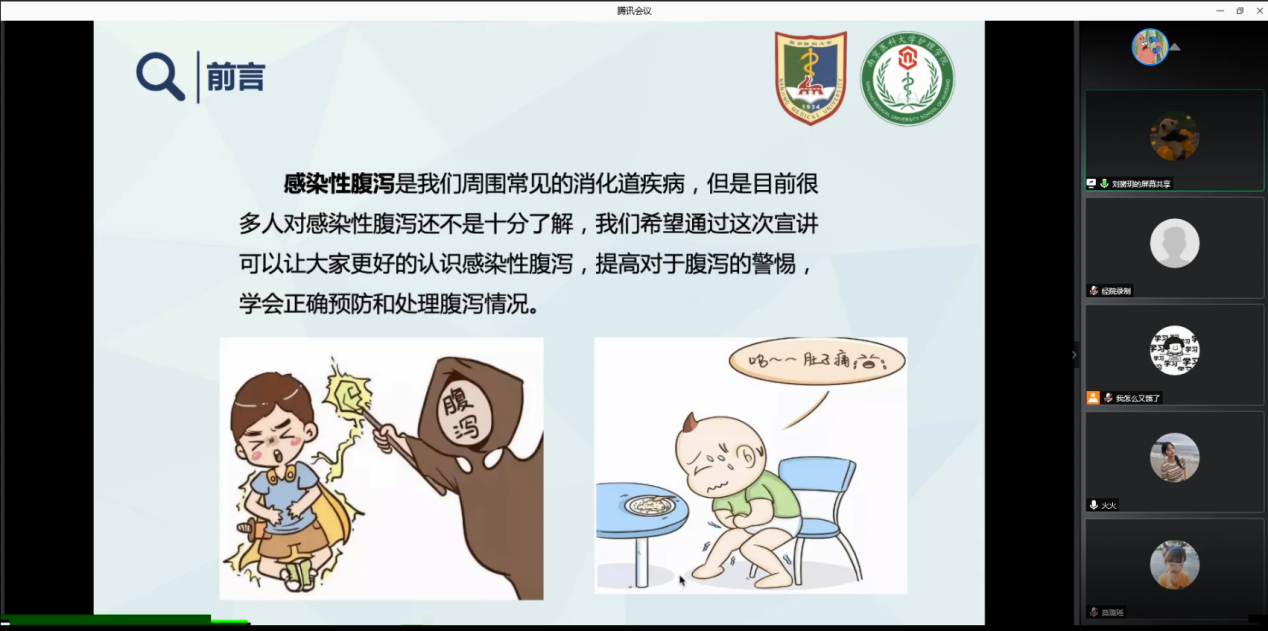 主讲人以新闻报道中出现的感染性腹泻病例引入,从基础知识、防治的重要性、如何预防以及如何处理四个方面作了较为全面的科普。她特别提醒大家,6-9月是感染性腹泻的高发季节,同学们平时应注意环境卫生、食品卫生以及个人卫生,一旦出现感染性腹泻的症状,需要及时就医诊治。对于如何应对感染性腹泻这一知识盲点,主讲人提出了三点基本原则,即纠正水和电解质紊乱、继续饮食、合理用药。在随后的提问环节中,有同学在线提问,“如何缓解考试紧张等心理因素引起的肠胃不适”“平时吃了不干净的东西肚子疼应如何解决”等等,宣讲团成员耐心解答并给出了相应的建议。活动结束后,同学们纷纷表示收获颇丰。
