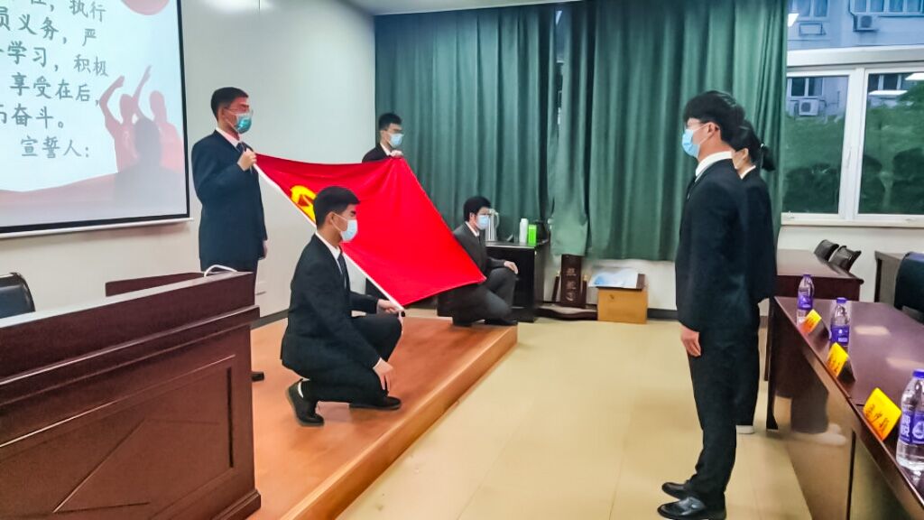 分团委书记潘怡老师来到台前,将团章与团员证郑重递与两位新团员,并亲自为他们佩戴好团徽。紧接着,分团委副书记张方正带领大家进行入团宣誓,两位新团员语气满是坚定、誓言饱含热情,他们所佩戴的团徽在他们的胸前闪闪发光,共青团员的担当与责任也从此在他们心中闪耀。