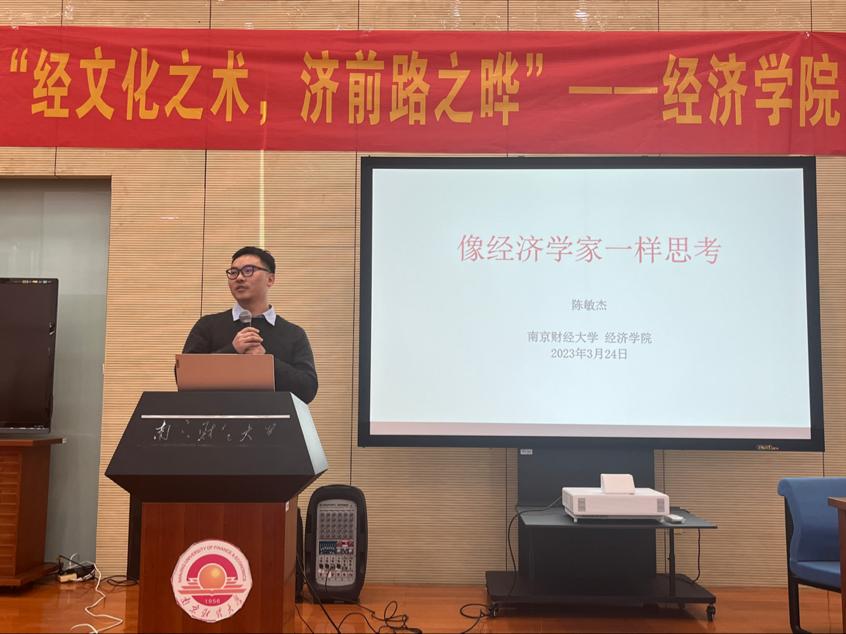开幕式后,陈敏杰老师作了主题为“像经济学家一样思考”的讲座。陈敏杰老师向大家阐释了经济学的定义,帮助同学们更好地理解经济学到底是什么,并讲述了地理因素对世界经济发展的影响,为同学们提供了新思路。他介绍了经济学科的庞大分支,并针对如何培养经济学兴趣提出建议:同学们在本科期间要重视经济学三大支柱——微观、宏观和计量经济学的学习,熟练掌握数据分析软件,同时线性代数、微积分和英语等学科的学习也要齐头并进,这都将为经济学学习打下坚实基础。互动答疑环节,陈敏杰老师就部分同学提出的“如何学好经济学”“经济学类有什么书籍推荐”等问题作了详细解答与细致指导。