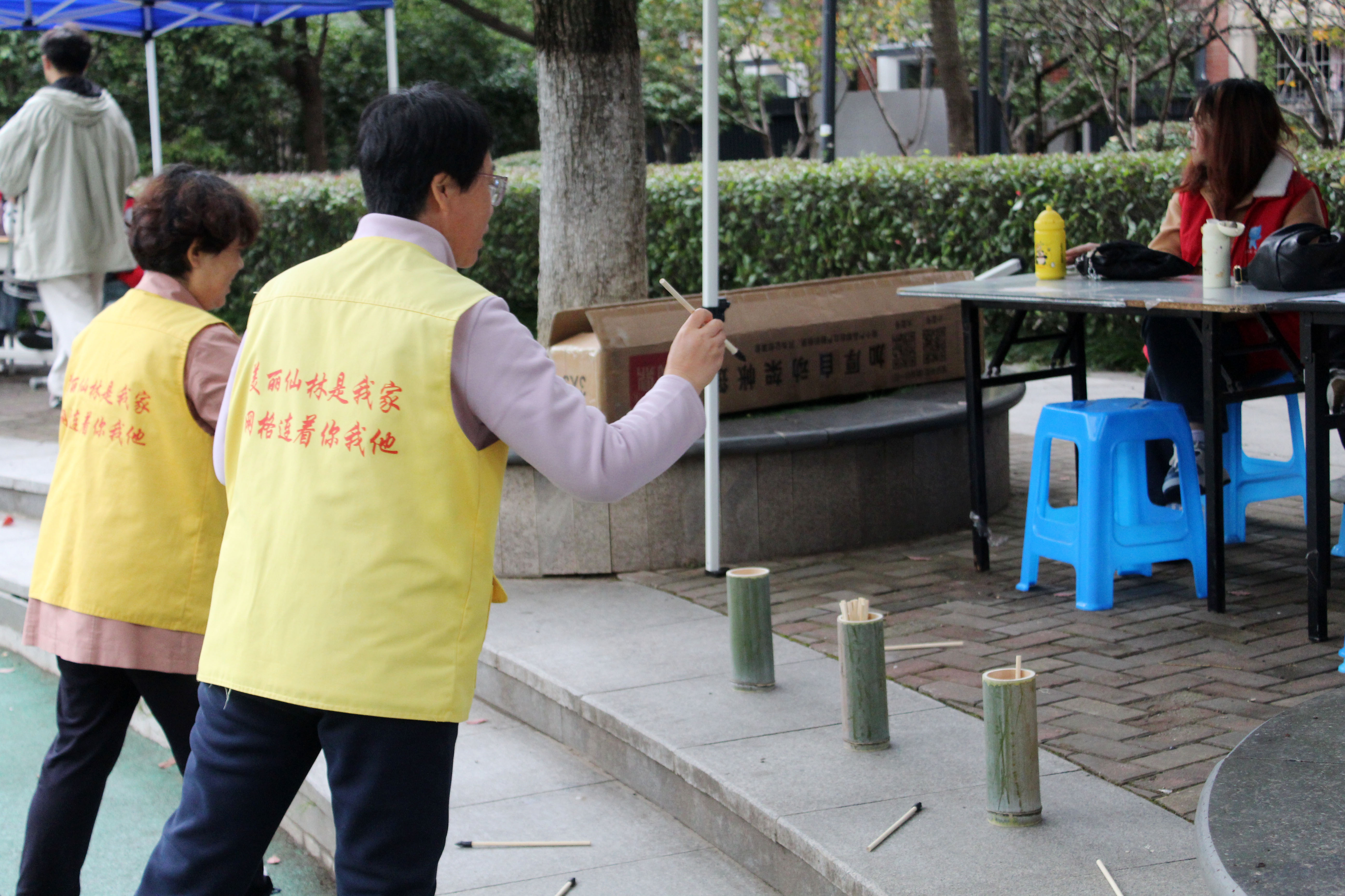 秋日游园会以一系列精彩纷呈的项目设置为参与者们呈现了一场传统文化的盛宴。投壶、京剧脸谱制作、漆扇扎染、中国结编织、书签创作及古诗词问答等项目交相辉映。得益于志愿者们的广泛宣传与细致讲解,活动吸引了众多居民与孩童的热情参与。投壶游戏前,孩童们排队参与,箭矢在空中划出一道道优美的弧线,令人在传统游戏中感受到中华文化的深厚底蕴。京剧脸谱制作区,志愿者们悉心指导,参与者们笔下生辉,色彩斑斓的脸谱彰显了京剧艺术的独特韵味。书签创作环节同样备受青睐,参与者们以绘画与书法为媒,创作出一个个蕴含深厚文化底蕴的书签。古诗词问答环节更是将文化氛围推向高潮,孩子们在家长与志愿者的鼓励下,流利背诵《悯农》《咏鹅》《山居秋暝》等经典诗作,展现出对中华古诗文化的浓厚兴趣与热爱,让这场秋日游园会成为了一次难忘的文化之旅。