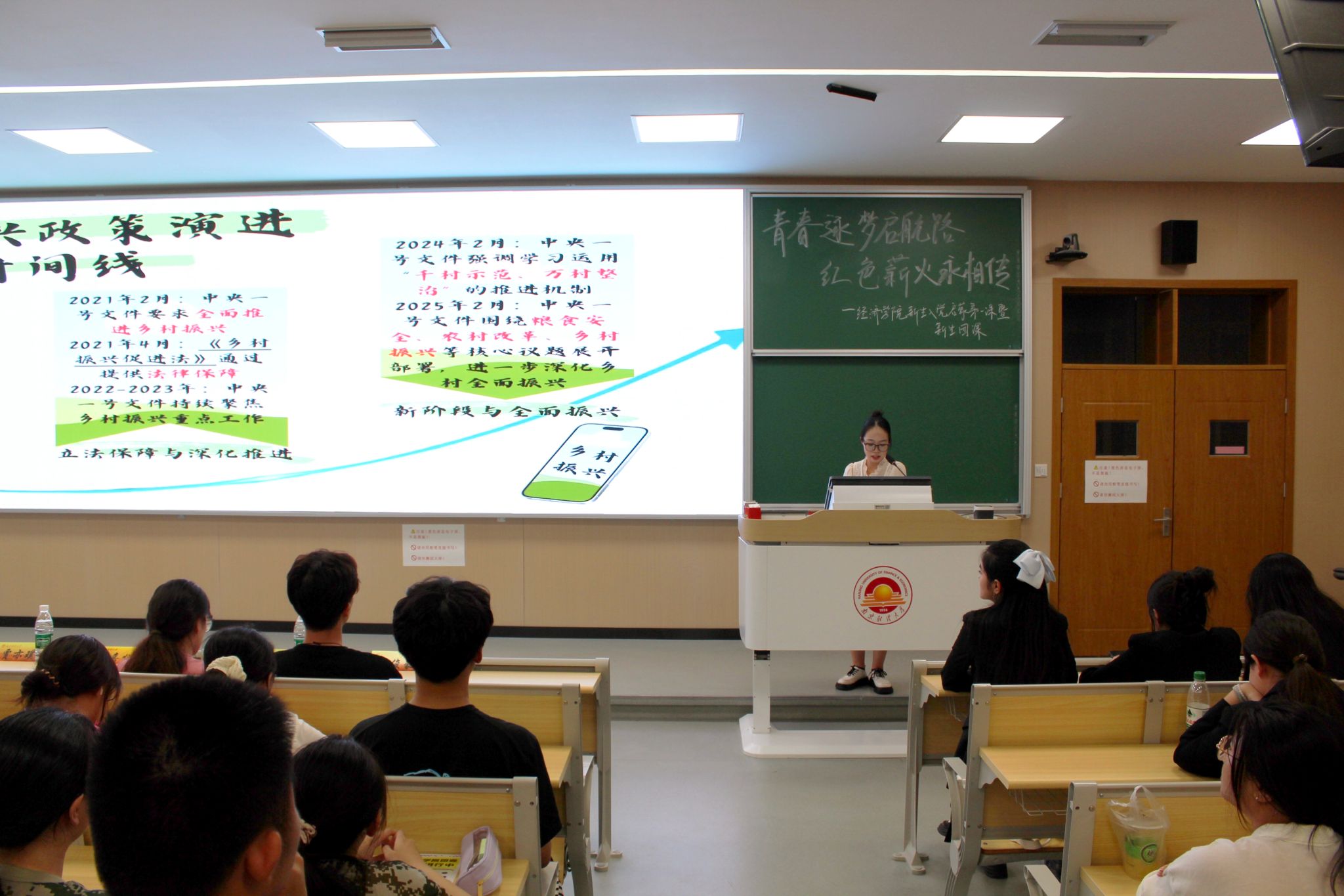 接着,经统2201秦嘉悦同学为同学们带来了一堂生动的团课,聚焦“明国策·识大势”“赴基层·绽芳华”“躬行践·真知悟”“当先锋·启新程”四个维度展开。她首先带领同学们梳理乡村振兴政策演进脉络,介绍大学生村官、西部计划、“三支一扶”等基层服务路径;随后结合自身参与的国家级大创项目暑期实践经历,分享团队深入12个省份调研形成的成果。此外,她通过政策解读、实践案例与成果展示,展现青年学子扎根基层、服务粮食安全的担当,为新生树立了“以知促行、以行践知”的榜样。