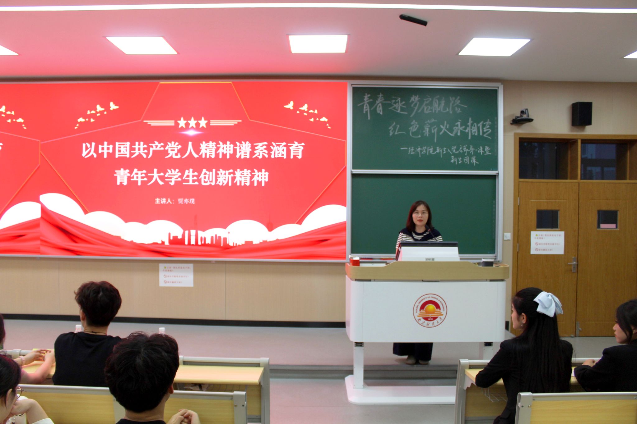 活动伊始,党委副书记贾亦璞老师以“以中国共产党人精神谱系涵育青年大学生创新精神”为题作新生入党启蒙第一课。贾老师深入挖掘中国共产党人的改革创新精神基因,指出井冈山斗争中“农村包围城市”道路的开辟、延安时期的革命实践、“两弹一星”的研制攻坚以及改革开放精神的铸就,共同构成了一脉相承的敢闯敢干、勇于创新的精神脉络。针对新时代青年创新精神的涵育,她强调,青年在思想上需树立创新意识,培养批判性思维与跨界学习能力;实践中要通过科研竞赛、岗位实习锤炼本领;个人素养上则需保持好奇心、提升抗压与执行能力。贾老师还指出,创新并非天赋而是可塑能力,新时代青年当立足专业、胸怀家国,将个人创新实践融入国家发展大局,在解决实际问题中实现人生价值。