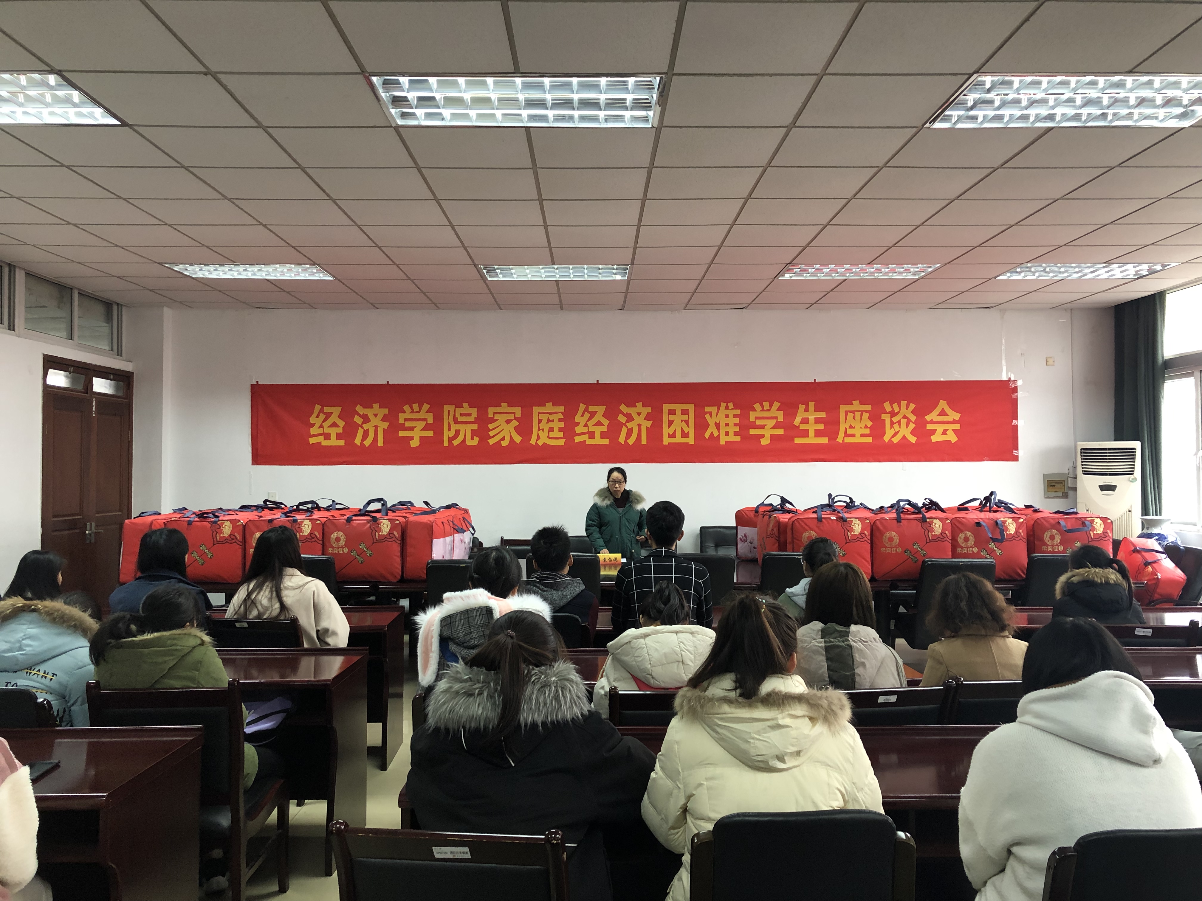 座谈会后,老师们为每一位同学发放御寒冬被,为学子们在寒冷的冬天送上一份温暖和祝福,预祝困难学生们在即将到来的期末考试中取得优异的成绩。