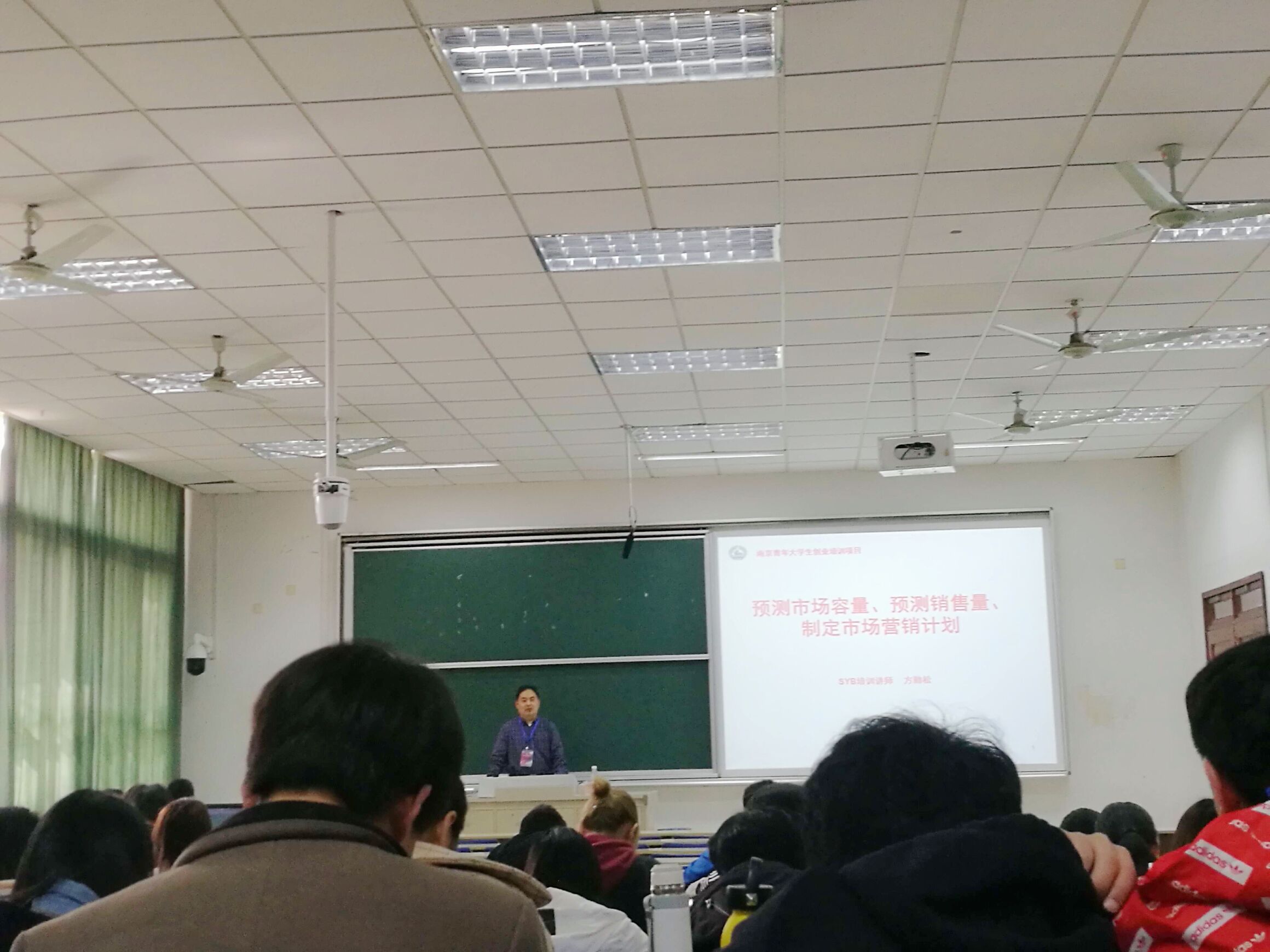 同学们开展了一场以“预测市场容量、预测销售量、制定市场营销计划”为主题的大学生创新创业培训讲座。