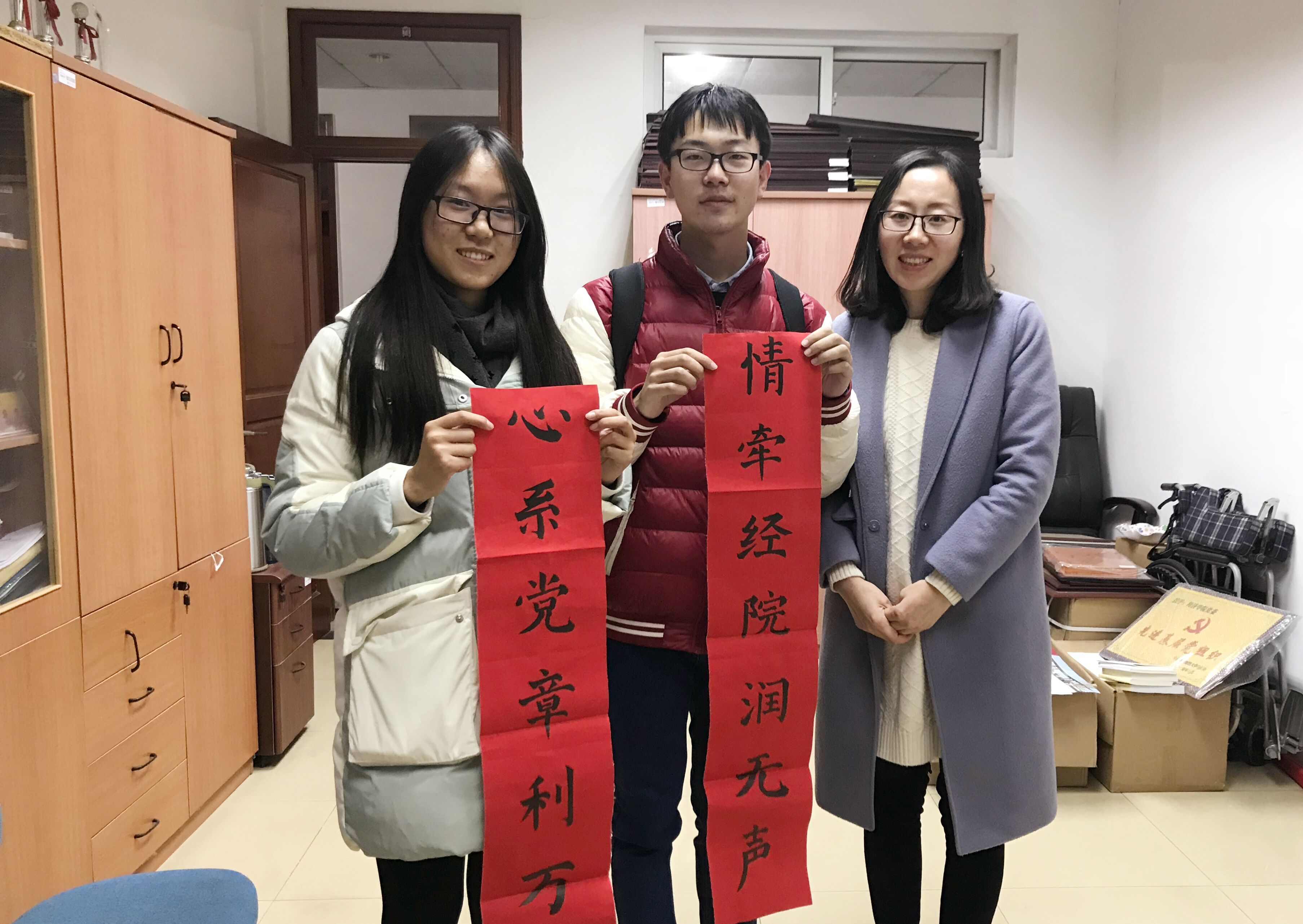 老师们的办公室,为老师们奉上一幅幅新年对联,表达新年祝愿。收到对联的老师们非常欣喜,有的主动要求贴在门上。老师们在欣喜之余,和同学们发出共同的倡议和祝愿:在新的一年里,南财师生携手奋进,砥砺前行,共同谱写凤凰娱乐城官方