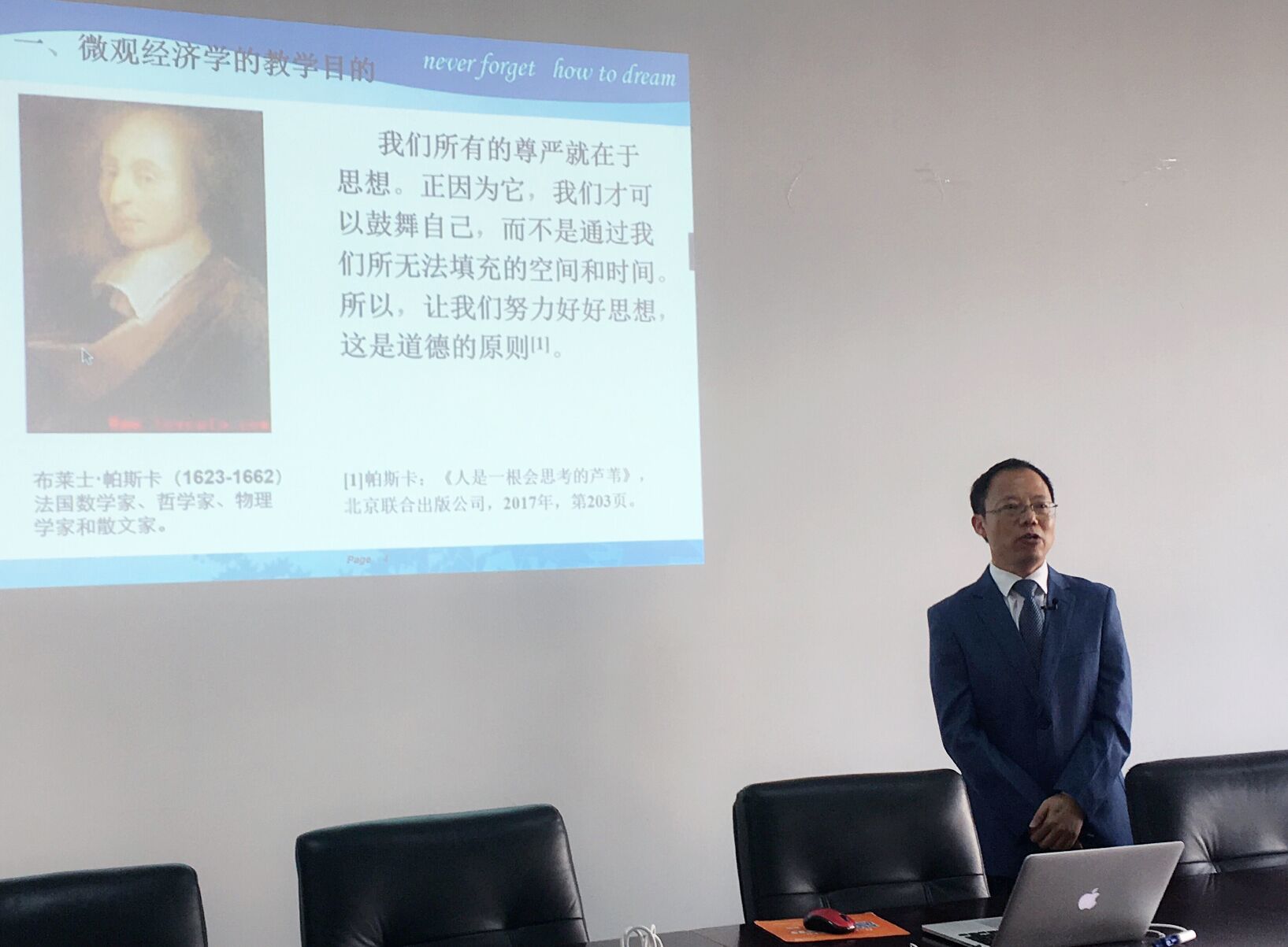 李政军教授做了题为《微观经济学的教学目的、思维方法和理论结构》的讲座,李教授从哲学视角出发,对前人研究成果进行高度总结概括,认为经济学教学的目的是教会学生经济学的思维方式。这种思维方式从方法论个人主义出发,重视人与人之间的互动关系,探讨经济理性主义。整个微观经济学的理论框架就是建立在方法论个人主义和经济理论主义的基础上,微观经济学中的消费者理论、生产者理论、市场理论、最优化理论、均衡理论均可以纳入到这个分析框架中。在座谈和交流环节,聆听讲座的各位老师与李教授针对微观经济学教学内容、教学方法、教学目标等若干问题展开了热烈的讨论。本次教学研讨活动的开展,使老师们进一步认识到经济学是一种分析方法,而不是一种教条,重在培养同学们一种思维方法。老师们还和李教授一起深入讨论了微观经济学知识体系、重点、难点、教学大纲的修订等问题。