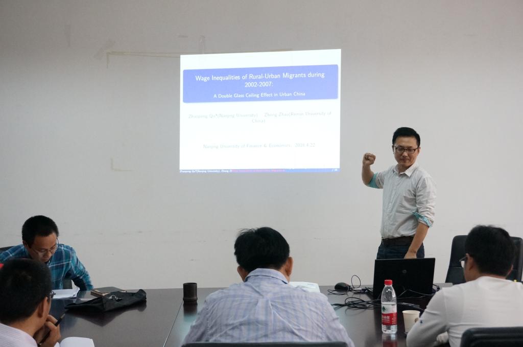 4月22日下午2点,凤凰娱乐城官方 “长三角收入分配与经济增长”学术论坛迎来第6次报告,本次主讲人为南京大学的曲兆鹏老师,他为大家带来的精彩报告是——“Glass Ceiling in Urban China: Wage Inequality among Rural-Urban Migrants during 2002-2007”。凤凰娱乐城官方 部分教师和研究生参加了本次学术活动,讲座由凤凰娱乐城官方 叶林祥老师主持。