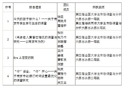 派出的4支参赛队伍,经过与来自全国高校二百多支队伍的角逐,获得了第四届全国大学生市场调查与分析大赛总决赛2个一等奖、2个二等奖,其中1支队伍(今天的孩子缺什么?——关于南京市学生学习生活的调查)从百所高校两百余支团队中脱颖而出,作为胜出的十支大陆代表队之一,与来自台湾地区选拔赛胜出的6支台湾代表队进行了两岸总决赛的最后比拼,获得第三届海峡两岸大学生市场调查与分析大赛总决赛三等奖。