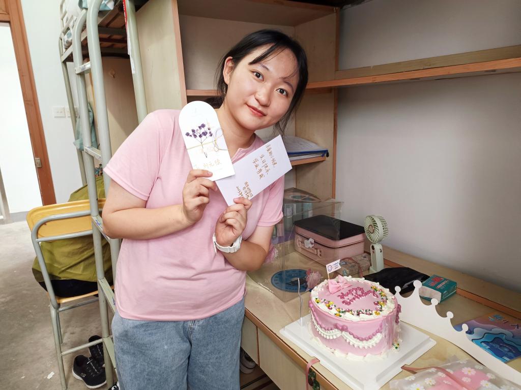 老师们专门为2位新生准备了生日蛋糕、贺卡及礼物,来到新生宿舍为小寿星们带来惊喜。在这场充满欢乐和感动的生日会上,张圣兵书记为来自河南的陈乐阳同学送上诚挚的生日祝福,希望陈乐阳同学在本科阶段里好好学习,争取在四年之后取得理想成绩。贾亦璞副书记为同学们分切生日蛋糕,与同学们一起为来自贵州的刘元续同学送上美好祝愿。