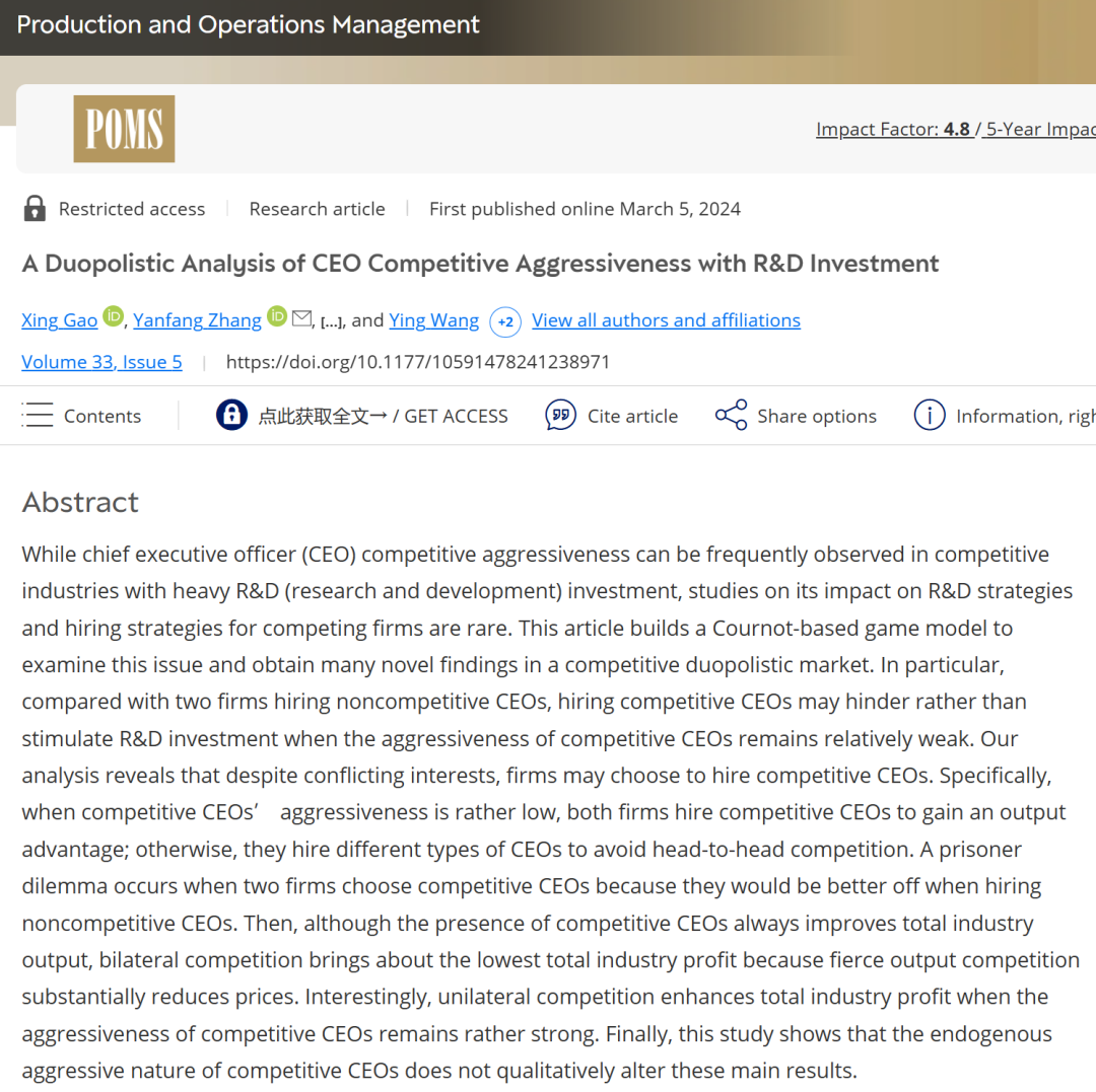 张艳芳副教授作为通讯作者和共同第一作者,在管理学国际顶级期刊《Production and Operations Management》发表题为“A Duopolistic Analysis of CEO Competitive Aggressiveness with R&D Investment”的学术论文。据悉,《Production and Operations Management》(POM)是全球公认的UTD24国际顶级期刊之一。
