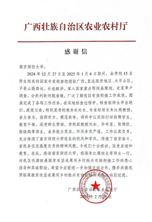 广西农业农村厅在感谢信中表示,南京财经大学核查组的辛勤付出和科学指导为广西乡村振兴事业注入了强劲动力,期待未来进一步深化合作,共同推动巩固拓展脱贫攻坚成果同乡村振兴有效衔接迈上新台阶。