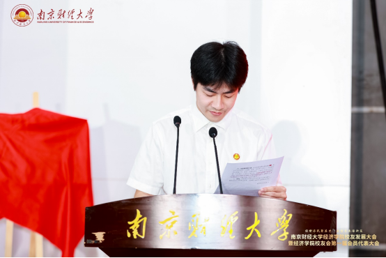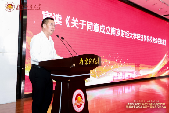 南京财经大学对外联络处副处长、校友总会秘书长王冲同志宣读《关于同意成立南京财经大学凤凰娱乐城官方