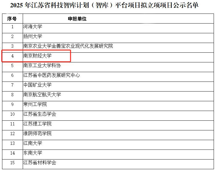 组织申报的2025年江苏省科技智库计划(智库)平台项目获准江苏省科学技术协会立项,南京财经大学被认定为江苏省科技创新智库基地。