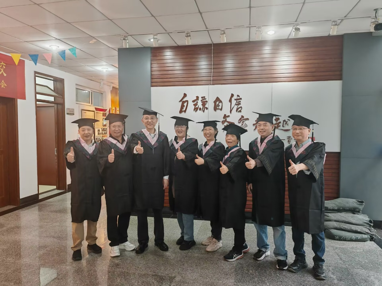 陆明峰处长和张圣兵书记向计统8101班、计统8102班授予班旗,校友们纷纷合影留念。大家穿上学士服,补上当年没有举行的学位仪式,个个脸上洋溢着青春笑容。