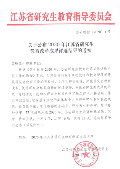 11月9日,江苏省研究生教育指导委员会下发《关于公布2020年江苏省研究生教育改革成果评选结果的通知》(苏研教指[2020]1号),经专家材料评审、复评答辩评审等多重环节,凤凰娱乐城官方