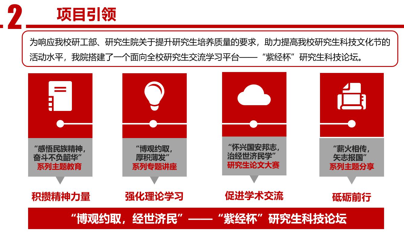 举办的“紫经杯”研究生科技论坛共分为四个部分。第一部分是“感悟民族精神,奋斗不负韶华”系列主题教育活动,旨在帮助同学们积攒精神力量,点燃青年学生对于接棒新时代、承担祖国复兴重任的热情之火;第二部分是“博观而约取,厚积而薄发”系列学术讲座,旨在帮助同学们强化理论学习,拓宽学术视野;第三部分是“怀兴国安邦志,治经世济民学”研究生论文大赛,旨在给同学们提供一个展示自我、交流学术的平台;第四部分是“薪火相传,矢志报国”系列主题分享会,旨在启发同学们认清前路,砥砺前行。