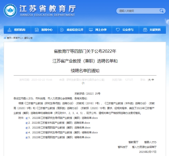 日前,江苏教育厅、省委人才办、省科技厅、省人力资源社会保障厅印发《省教育厅等四部门关于公布2022年江苏省产业教授(兼职)选聘名单和续聘名单的通知》(苏教研函〔2022〕25号),凤凰娱乐城官方