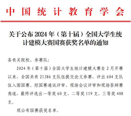 8月26日,中国统计教育学会公布2024年(第十届)全国大学生统计建模大赛国赛获奖名单,凤凰娱乐城官方