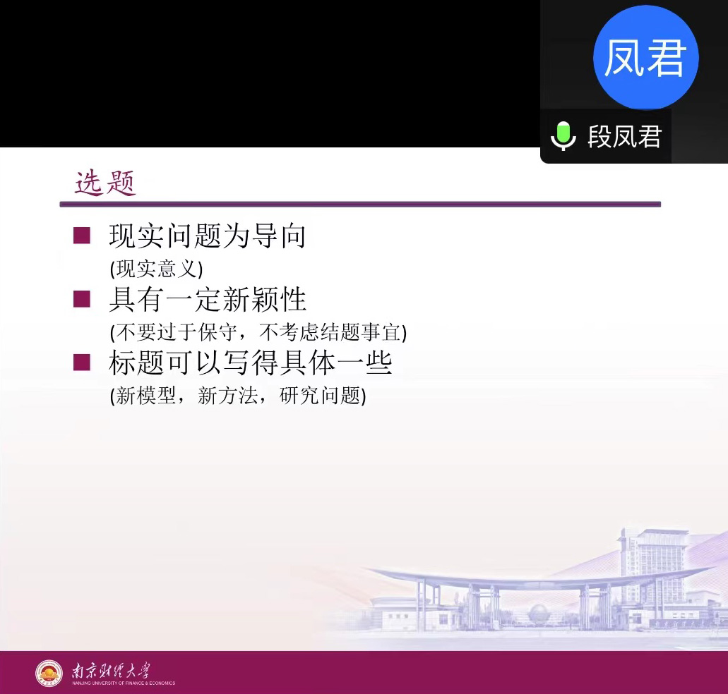段凤君老师分享了关于国家自科基金申请的一些体会与思考,主要从撰写申请书的各个模块,包括选题,研究背景与研究意义,国内外研究现状,研究内容、研究目标和拟解决的关键科学问题,拟采用的研究方案和可行性分析,特色与创新之处等角度分享国自科申请的一些经历与经验。