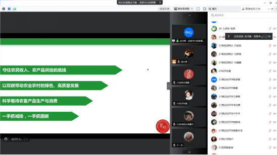 金书秦研究员结合自身丰富的一线工作经验,将农业比作人,生动形象地解释了农业生产和排放的原因与我国农业绿色发展的历程。此外,他深度剖析了如今农业发展存在的问题以及农业绿色发展的重要意义,通过分享在农业绿色发展与双碳战略方面的研究成果,分析了农业绿色发展面临的新形势以及未来的发展战略。在交流互动环节,参会师生就农业农村领域的减施减排、积极发挥市场化手段以及如何撰写高质量的学术论文等问题积极提问,展开深入的讨论与交流,氛围热烈。