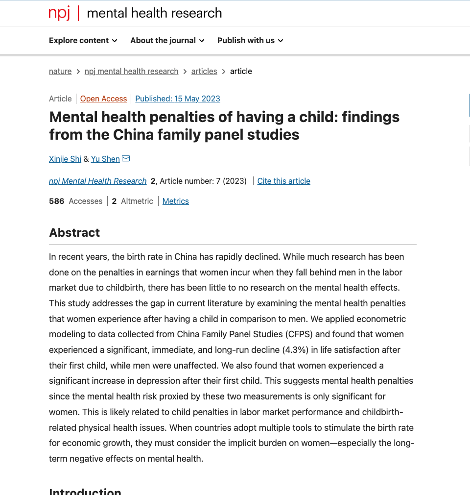 近日,南京财经大学凤凰娱乐城官方 沈煜作为通讯作者,与浙江大学中国农村发展研究院史新杰研究员合作的论文《Mental health penalties of having a child: findings from the China family panel studies》被Nature旗下子刊npj Mental Health Research录用并在线发表。