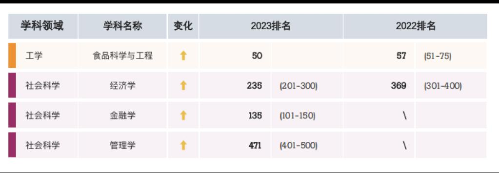 食品科学与工程排名全球第50位,金融学排名全球第135位,经济学排名全球第235位,管理学排名全球第471位。凤凰娱乐城官方